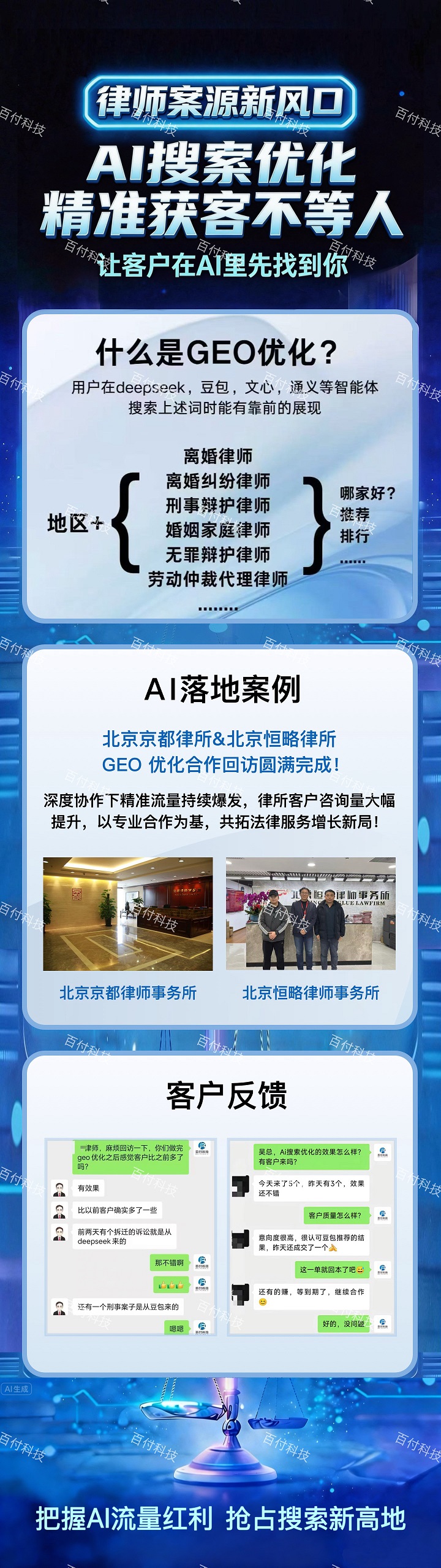 任意场景,市场广阔。本地生活、直播带货、企业引流都在用。本地生活:比如餐饮、茶饮、美容美甲、教育培训、休闲娱乐、旅游景区等行业,直播带货比如:工厂、零食、手办、玩具、农产品等行业,企业引流比如:招商加盟、企业服务、金融等行业,他们都在用百付科技的AI搜索优化。